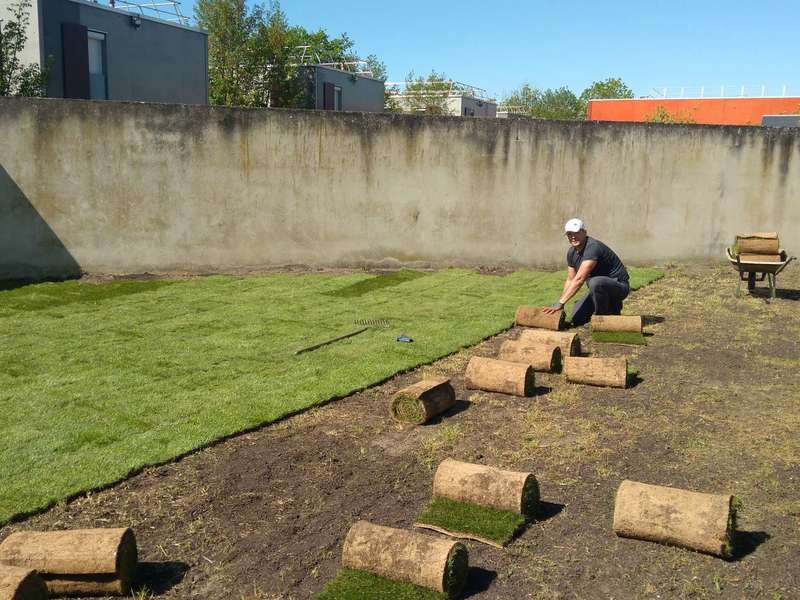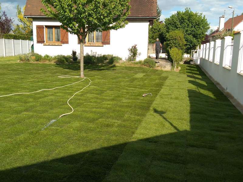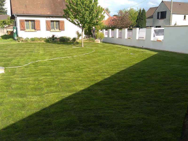 Création de gazon en pose de rouleau à l'anglaise : Jardin situé à Conflans ste honorine ( 78700 ), le 1er jour , nous avons préparé le terrain afin de pouvoir y déposé le gazon en rouleau fourni et livré par l'entreprise C&G entretien